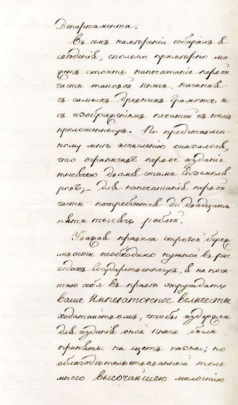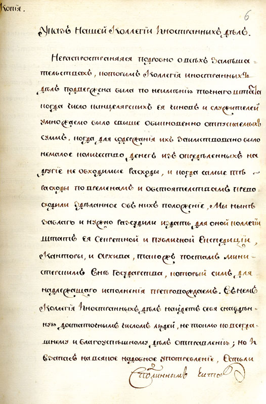 Из доклада графа Румянцева императору Александру I от 25 февраля 1811 года: «Усердствуя пользам всемилостивейше вверенного мне иностранного департамента и желая споспешествовать образованию чиновников, вновь посвящающих себя сему служению, равно как распространению общеполезных сведений, я давно занимался мыслью, сколь полезно нужно было бы в сем отношении издать в свет полное собрание дипломатических актов наших… как то: древних актов и других договоров России с разными державами, хранящихся в архиве иностранного департамента»3. На докладе резолюция императора: «Быть по сему».