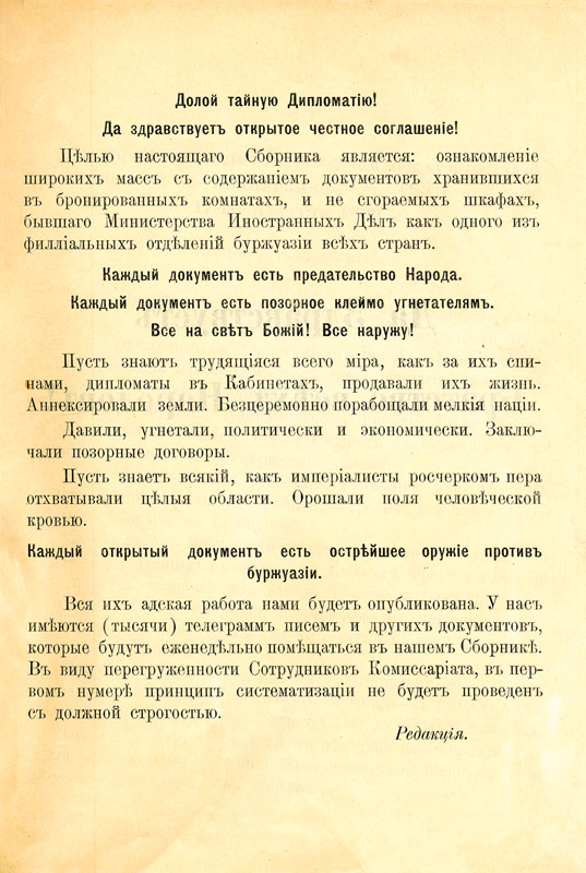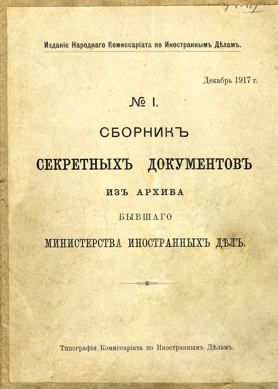 «Сборник секретных документов из архива бывшего Министерства иностранных дел». №1. Декабрь 1917 г. Типография Комиссариата по иностранным делам, Петроград