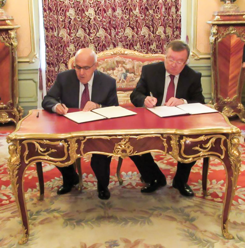 Директор Историко-документального департамента МИД России А.И.Кузнецов (справа) и директор Дипломатического института МИД Португалии Ф.Ферраж подписывают Меморандум о взаимопонимании о сотрудничестве в области архивов и Протокол о подготовке совместного сборника архивных документов. Москва, 30 сентября 2015 г. АВП РФ. Фотофонд