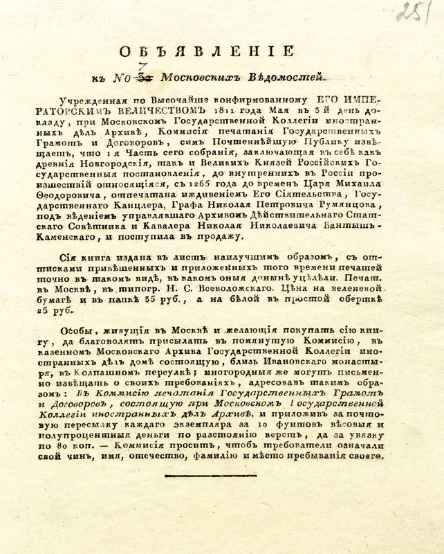 Объявление о поступлении в продажу первой части «Собрания государственных грамот и договоров», подготовленного Комиссией печатания государственных грамот и договоров, в газете «Московские ведомости». №7. 1815 г. АВПРИ. Ф. 1, III-19, 1813-1817 гг. Д. 1. Ч. 3. Л. 251. Печатный экземпляр, рус. яз.