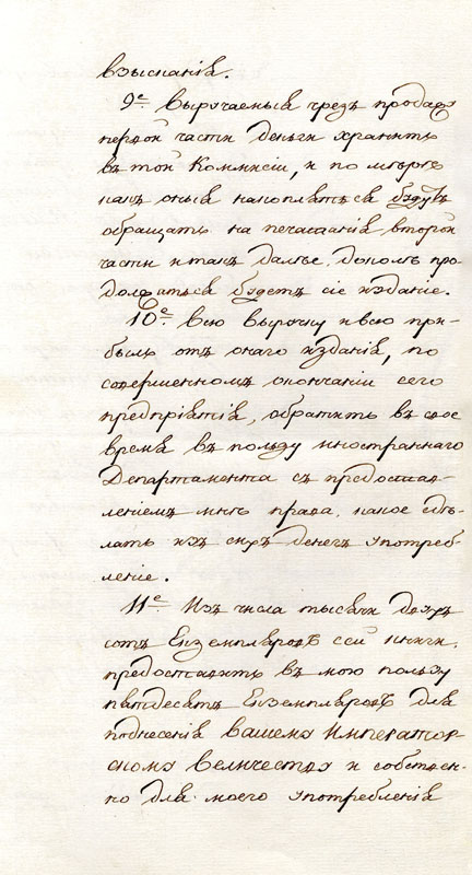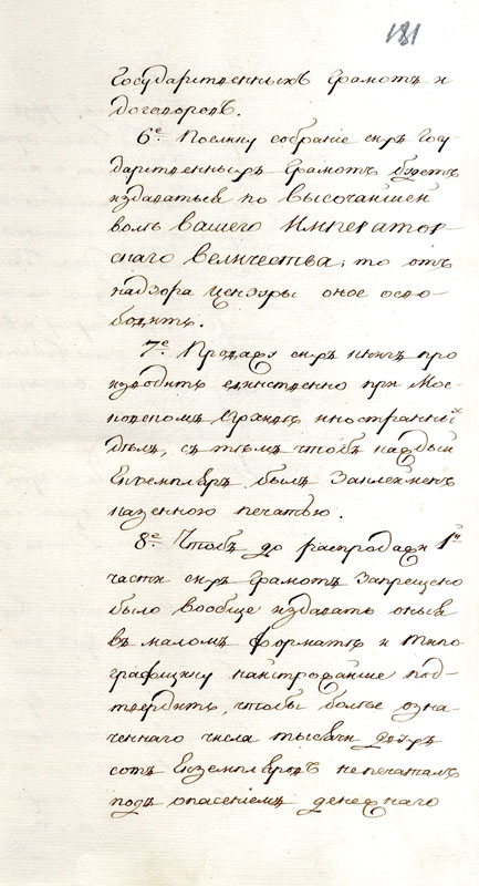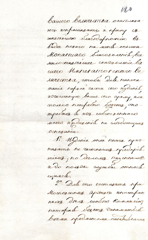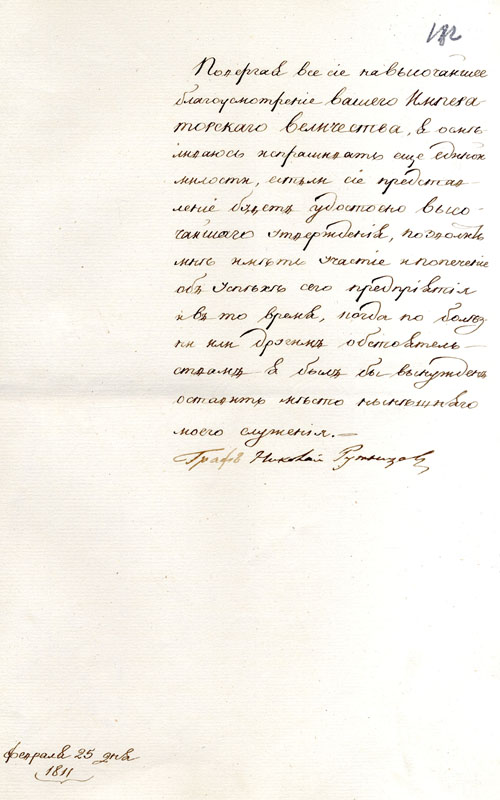 Доклад канцлера Н.П.Румянцева императору Александру I с предложением учредить при Московском архиве Коллегии иностранных дел Комиссию печатания государственных грамот и договоров. 25 февраля 1811 г. АВПРИ. Ф. 1, I-11, 1805-1812 гг. Д. 1. Л. 179-182. Подлинник, рус. яз.