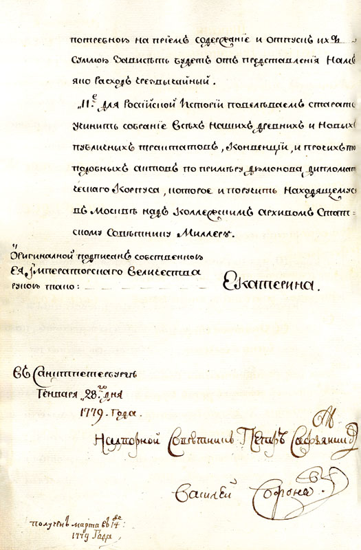 Начало было положено Указом Екатерины II «О штатах Коллегии иностранных дел» 28 января 1779 года, где в пункте 11 говорилось: «Для российской истории повелеваем стараться учинить собрание всех наших древних и новых публичных трактатов, конвенций и прочих тому подобных актов по примеру Дюмонова1 дипломатического корпуса, которое и поручить находящемуся в Москве над коллежским архивом статскому советнику Миллеру»2. Управляющий Московским архивом Коллегии иностранных дел Г.Ф.Миллер успел подготовить собрание трактатов между русским и римским дворами с пояснениями на немецком языке. Однако после его смерти в 1783 году преемники не были уполномочены на продолжение издания, и дело остановилось.