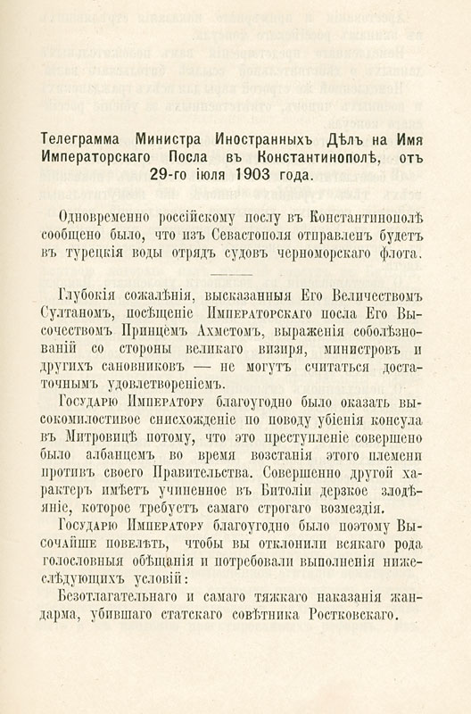Телеграмма министра иностранных дел Российской империи послу в Константинополе. 29 июля 1903 г. «Ежегодник Министерства иностранных дел». 1903 г. Типография Тренке и Фюсно, Санкт-Петербург