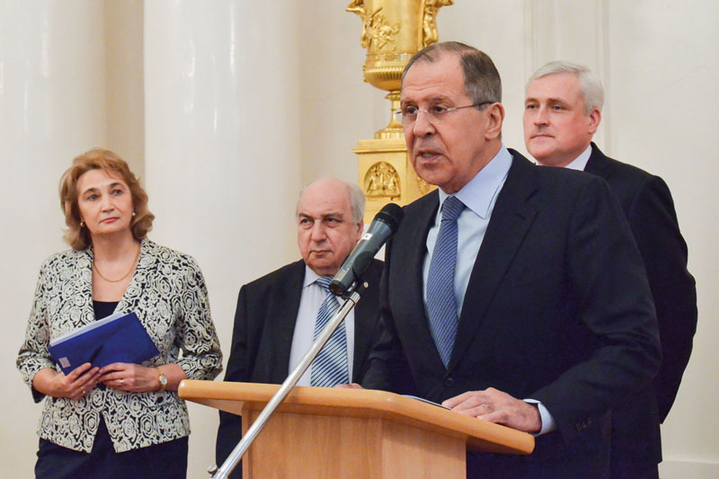 Выступление министра иностранных дел Российской Федерации С.В.Лаврова на презентации XXVI тома сборника «Документы внешней политики СССР» (1943 г.). Слева направо: директор Историко-документального департамента МИД России Н.М.Баринова, научный руководитель Института всеобщей истории РАН, академик РАН А.О.Чубарьян, заместитель руководителя Федерального архивного агентства А.В.Юрасов. Особняк МИД России. Москва, 8 февраля 2017 г. АВП РФ. Фотофонд