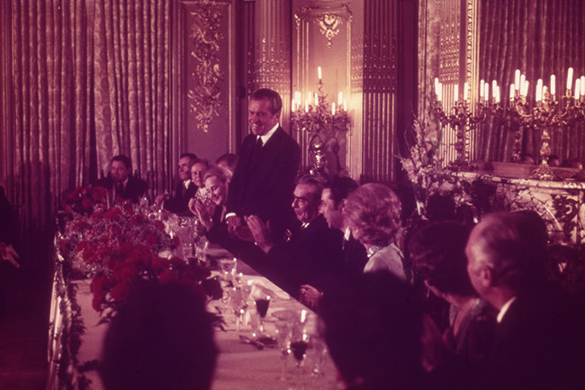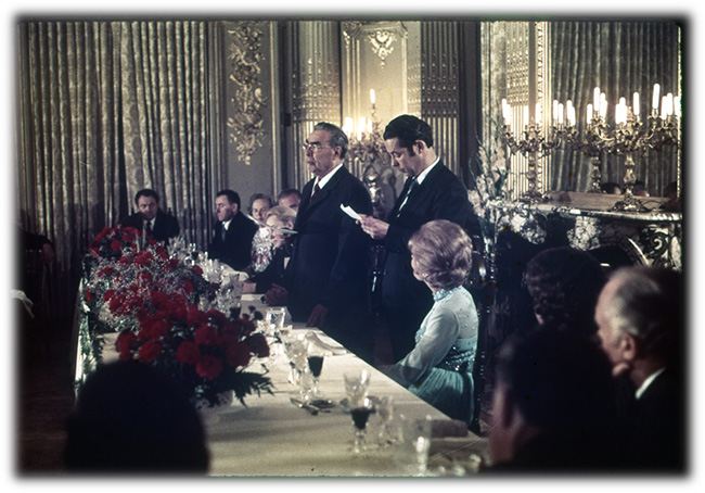 Наступило время торжественного обеда, и в Посольство прибыл господин Никсон с супругой и другие официальные лица. Зал Посольства был торжественно украшен и готов к обеду. За обедом по очереди выступили Л.И. Брежнев и президент Р. Никсон:
