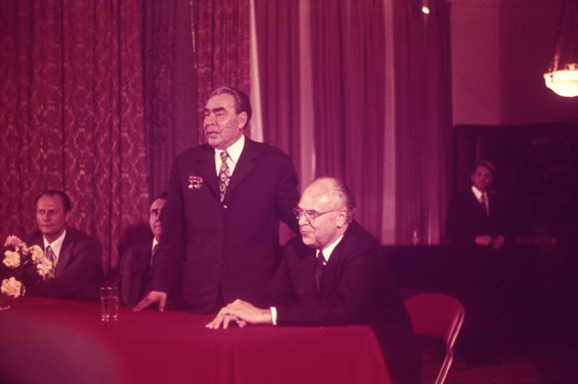 На этом снимке Л.И. Брежнев выступает перед коллективом Посольства. Рядом с ним Посол А.Ф. Добрынин: