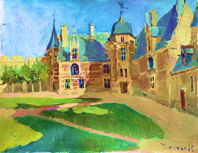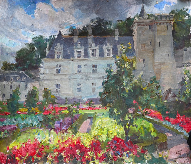 Приметой каждого из замков, как правило, являются сады и парки, над которыми трудились выдающиеся ландшафтные архитекторы, и, несомненно, их великолепие нашло своё отображение на холстах петербургских живописцев. Особенно их воображение восхитили сады замка Вилландри. Как поделились с нами гости из северной столицы России, собор в Руане, напоминавший парижский Нотр-Дам, оставил неизгладимое впечатление. Однако и это было не самым ярким воспоминанием – гостеприимство хозяйки замка XVI в. Эне-ле-Вьей, пригласившей группу художников из Санкт-Петербурга погостить в исторических интерьерах своего поместья, завершило творческое путешествие новыми образами и смыслами.