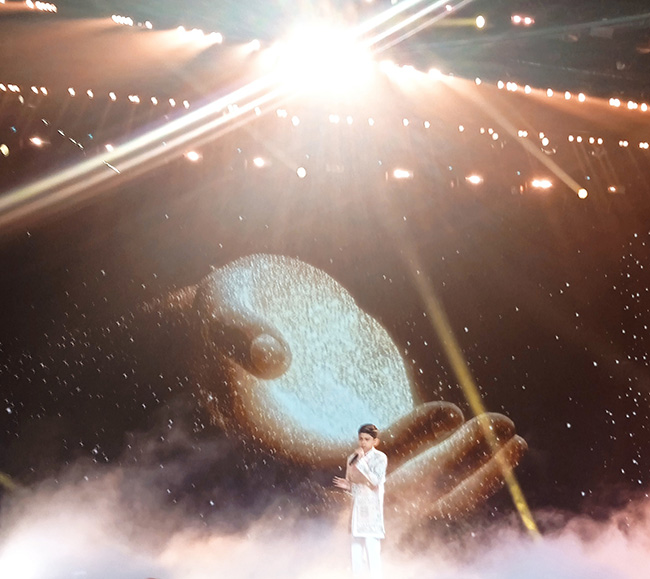 Выступление практически каждого исполнителя сопровождалось красочными спецэффектами – бенгальскими огнями, световым оформлением, танцевальными группами. Но песня гостя из Индии – Нишанта Гупты звучала лишь на фоне масштабного изображения рук в каплях росы, а когда он запел – такой маленький и скромный – голос его звучал, казалось, на всю Вселенную, а главное – как он им владел и какие переливы!