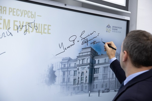 В завершение официальной части церемонии начальник ГлавУпДК В.Н.Фатин, заместитель директора Департамента управления делами МИД России Р.Я.Садулин и первый проректор Дипакадемии П.Б.Уксусников оставили памятные пожелания студентам на интерактивной доске. Этот «цифровой» жест символически заменил привычное перерезание ленточки, подчеркнув инновационный формат события.