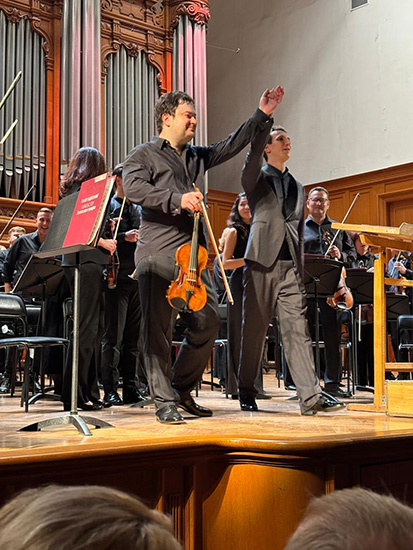 Скрипач-виртуоз Иван Почекин и главный дирижер Большого симфонического оркестра имени П.И. Чайковского Арсентий Ткаченко