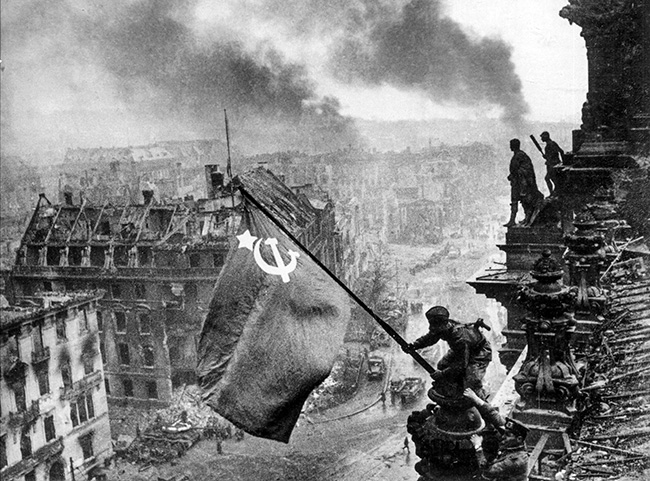 Халдей был действительно боевым корреспондентом. Смелым и отчаянным. Благодаря личным связям пробирался для съёмки в самые немыслимые места, например, в бомболюк самолёта. Делал постановочные кадры, свидетельствующие об освобождении городов, шил для них знамёна. Так было и в Севастополе в 1944 году, и в Будапеште в 1945-м, и, конечно, в Берлине. 30 апреля 1945 года, прилетев в Москву из Вены, он узнал об освобождении столицы Германии. Получив в редакции подтверждение командировки в Берлин и понимая необходимость сделать важный кадр, символизирующий окончание войны, раздобыл три красных скатерти (найти красную ткань было невозможно). Выкроил из них три флага, нашил на каждый серп и молот, вырезанные из простыни, и обвязался этими полотнищами под одеждой, чтобы незаметно взять с собой. Второго мая в подвале практически разбитого Рейхстага ещё находилось много нацистов, которые продолжали отстреливаться, но Халдею с тремя добровольцами удалось подняться на крышу, где они и сделали исторический кадр.