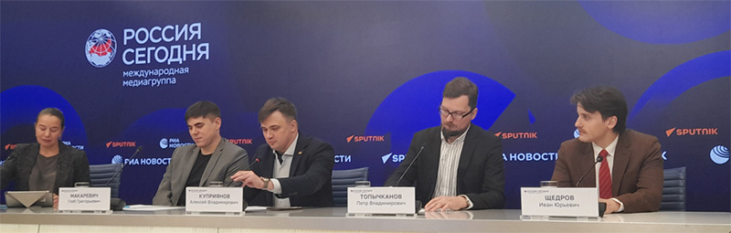 На пресс-конференции «Российско-индийские отношения: актуальное состояние». Слева направо: О.Буряк (модератор), Г.Макаревич, А.Куприянов, П.Топычканов, И.Щедров.
