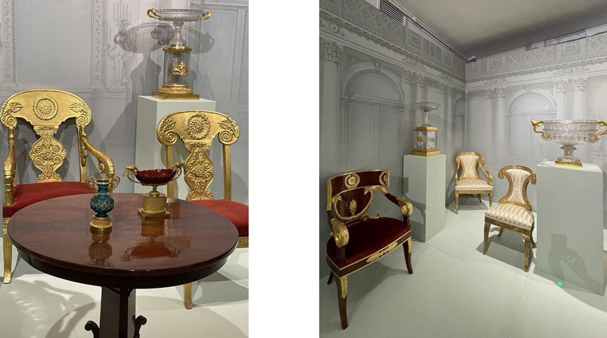 В 1816 году Росси был назначен придворным архитектором у Александра I. Последующее десятилетие стало расцветом его творчества. Он строил новые дворцы – Михайловский, Елагинский и реконструировал интерьеры уже существовавших – Зимнего, Аничкова, Павловского. Росси всегда сам проектировал мебель. Его идеи воплощали мебельных дел мастера, которые понимали обаятельного Карла буквально с полуслова. Среди производителей мебельного и бронзового дела – фабрикант Иван Иосифович Бауман, мебельный мастер Василий Иванович Бабков, и знаменитый к тому времени Генрих Гамбс. В экспозиции представлены предметы гарнитуров, созданных России в 1817 – 1818 гг. для Аничкова и Зимнего дворцов. В Аничковом дворце архитектор создал покои для новобрачных: Великого Князя Николая Павловича, будущего императора Николая I, и его супруги Александры Федоровны. Бракосочетание состоялось летом 1817 года.