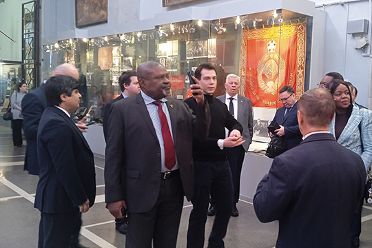 Главы дипломатических миссий, 40 послов и временно поверенных трех континентов – Латинской Америки, Африки и Азии, аккредитованных в Москве, посетили Центральный музей Вооруженных Сил Российской Федерации. Мероприятие инициировали и организовали Департамент государственного протокола МИД России совместно с Департаментом культуры Министерства обороны Российской Федерации. В фойе музея гостей встречал военный оркестр Преображенского полка мелодиями из произведений русской и советской классики военных лет. Гостям была представлена обновленная экспозиция, посвященная, Великой Победе СССР и союзников над нацистской Германией во Второй мировой войне, а также уникальные реликвии, хранящиеся в закрытых фондах музея. В частности, дипломаты увидели знамена от благодарных народов Европы, спасенных воинами Красной Армии, таких как Австрия, Болгария, а также военные трофеи, среди которых – жезл генерала-фельдмаршала Э. Ромеля. Всего же в музее - более 840 тысяч экспонатов, и половина из них составляет коллекцию Второй мировой войны.