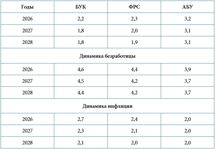 Существуют различные оценки динамики ключевых макроэкономических показателей США в ближайшие годы - в период 2026-2028 годов. Приведем оценки трех весьма авторитетных источников экономических прогнозов - Бюджетного управления Конгресса США (БУК), Федеральной резервной системы США (ФРС) и Административно-бюджетного управления США (АБУ), находящегося в ведении Исполнительного управления президента.