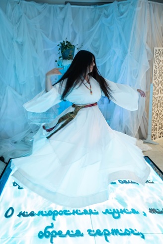 В одном из залов на полу была установлена большая видеоплатформа, на которой самозабвенно кружилась женщина в белых одеждах с распущенными черными волосами – последовательница суфийского ордена Мевлеви по имени Хиса. Под ее ноги вверх по платформе стремительно «уплывали» строчки со стихами Джелаладдина Руми.