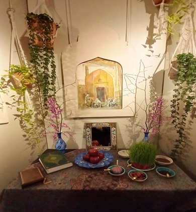 Атрибутами новогоднего стола являются также зеркало, горящие свечи, золотые рыбки в небольшом аквариуме и главные книги в каждом иранском доме – Коран и томик стихов Хафиза. На столе «хафт-син» в Музее Востока есть всё, что полагается, кроме свечей и рыбок – все-таки это музей.